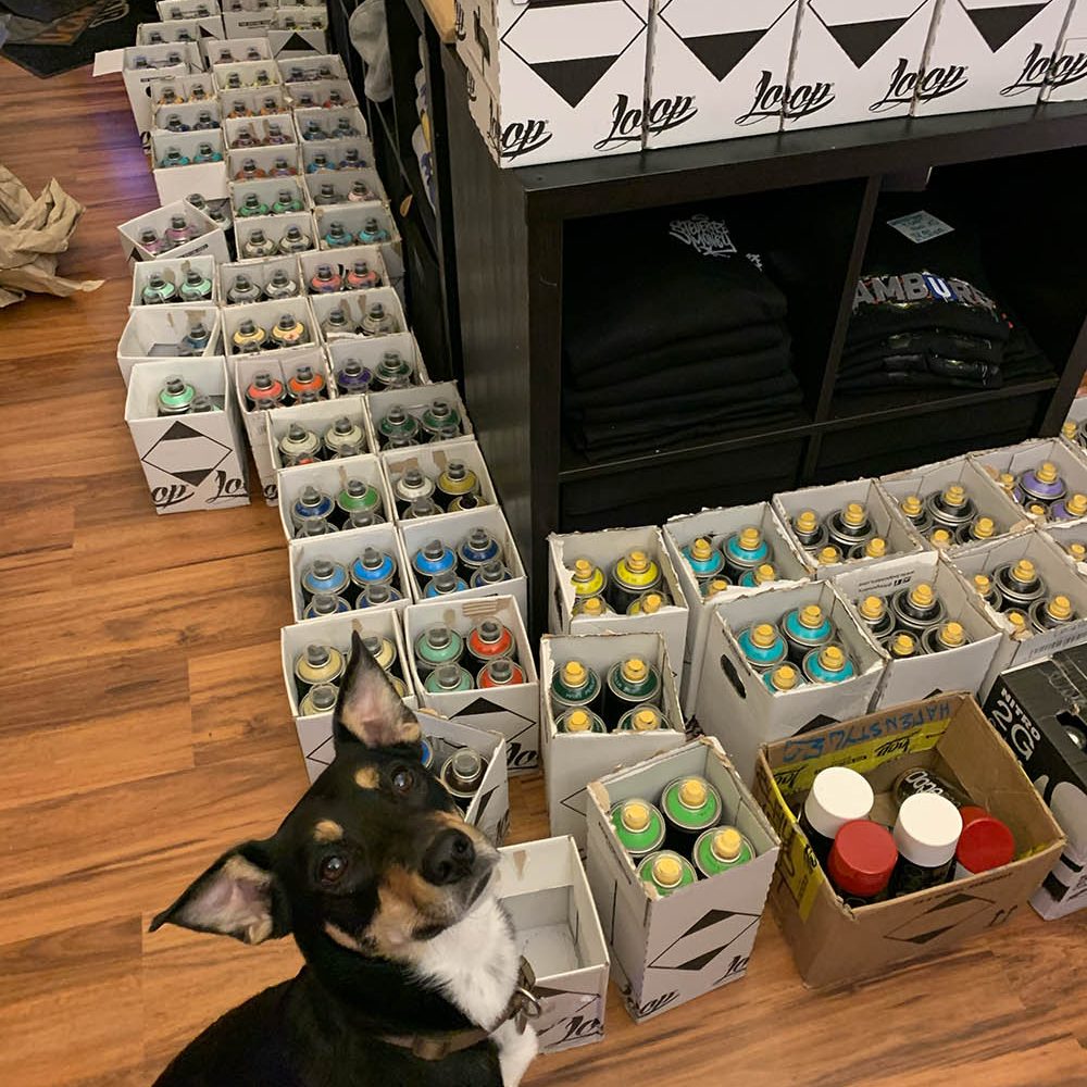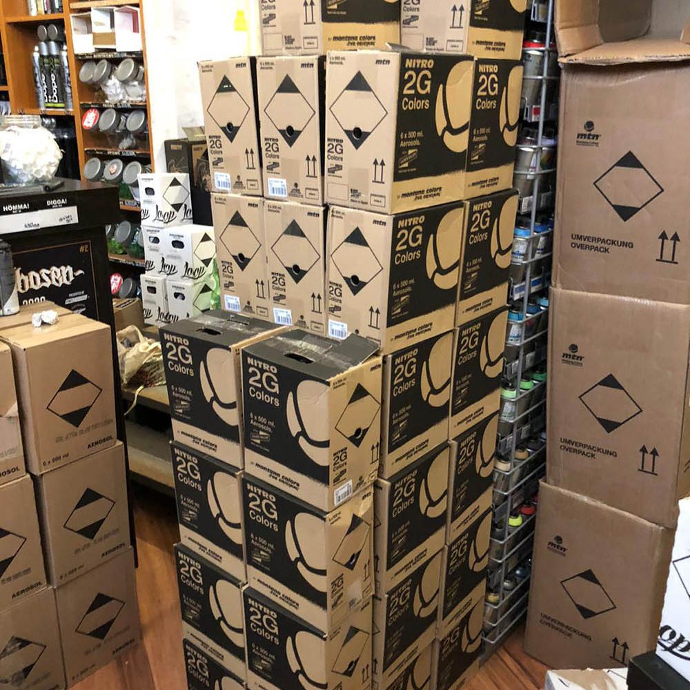Zur Auswahl hatten unsere Kunden die gesamte Farbpalette der damals noch neue Loop Colors Sprühdosen, außerdem hatten wir das gesamte Sortiment an Montana Black Kannen, sowie die Montana Gold Shock Töne im Angebot. In diesem Bereich gab es eine Regel, keine Rucksäcke! Montana Colors und viele weitere Marken gab es bei uns am Tresen.